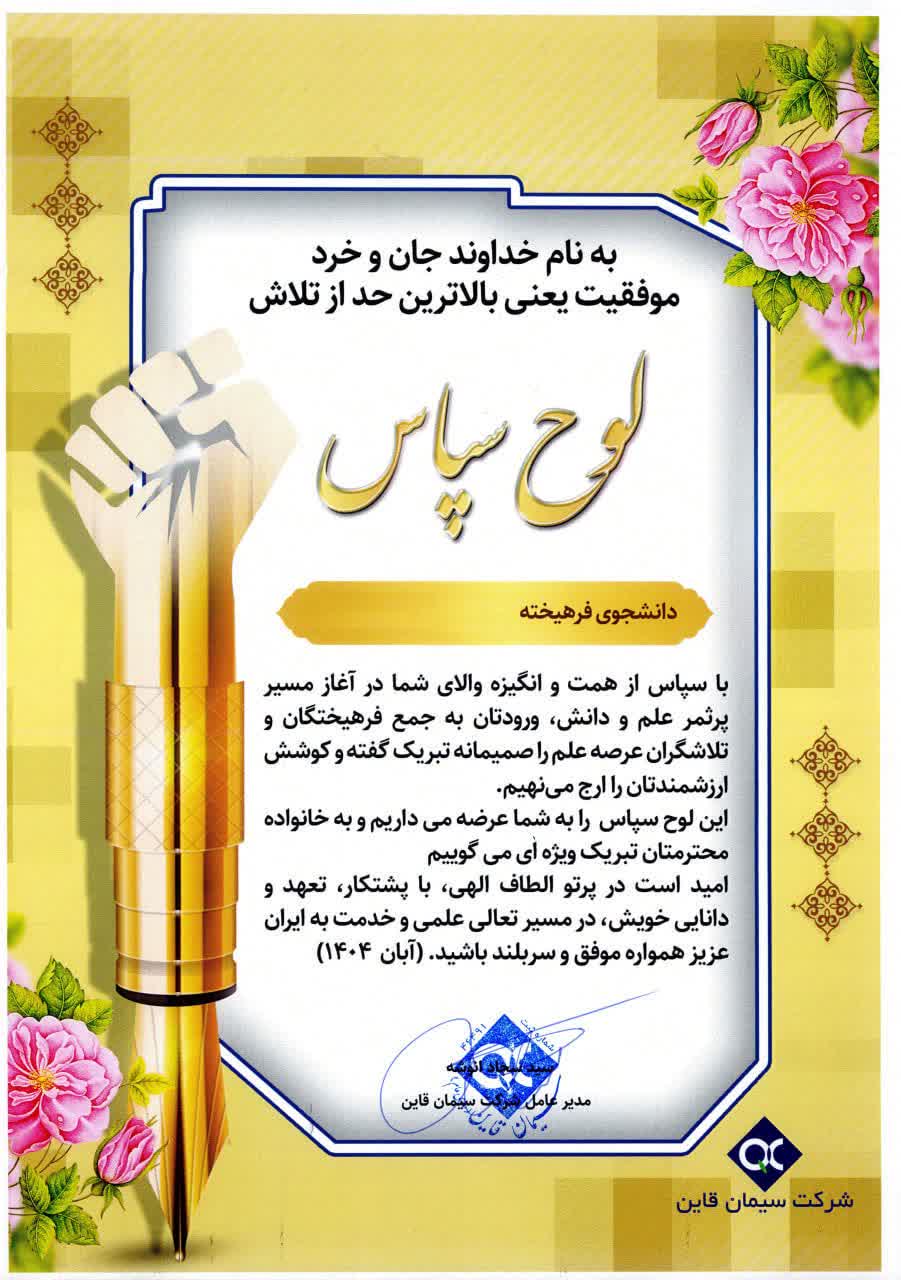 پس از تبادل دیدگاه میان دانشجویان، والدین و مدیرعامل، به منظور قدردانی از تلاشهای علمی و انگیزه نبالای دانشجویان، لوح سپاس و هدیهای یادبود از سوی شرکت سیمان قاین به آنان اهدا شد. این نشست صمیمانه با تاکید بر تداوم حمایت مجموعه از برنامههای آموزشی و مهارتی دانشجویان پایان یافت.